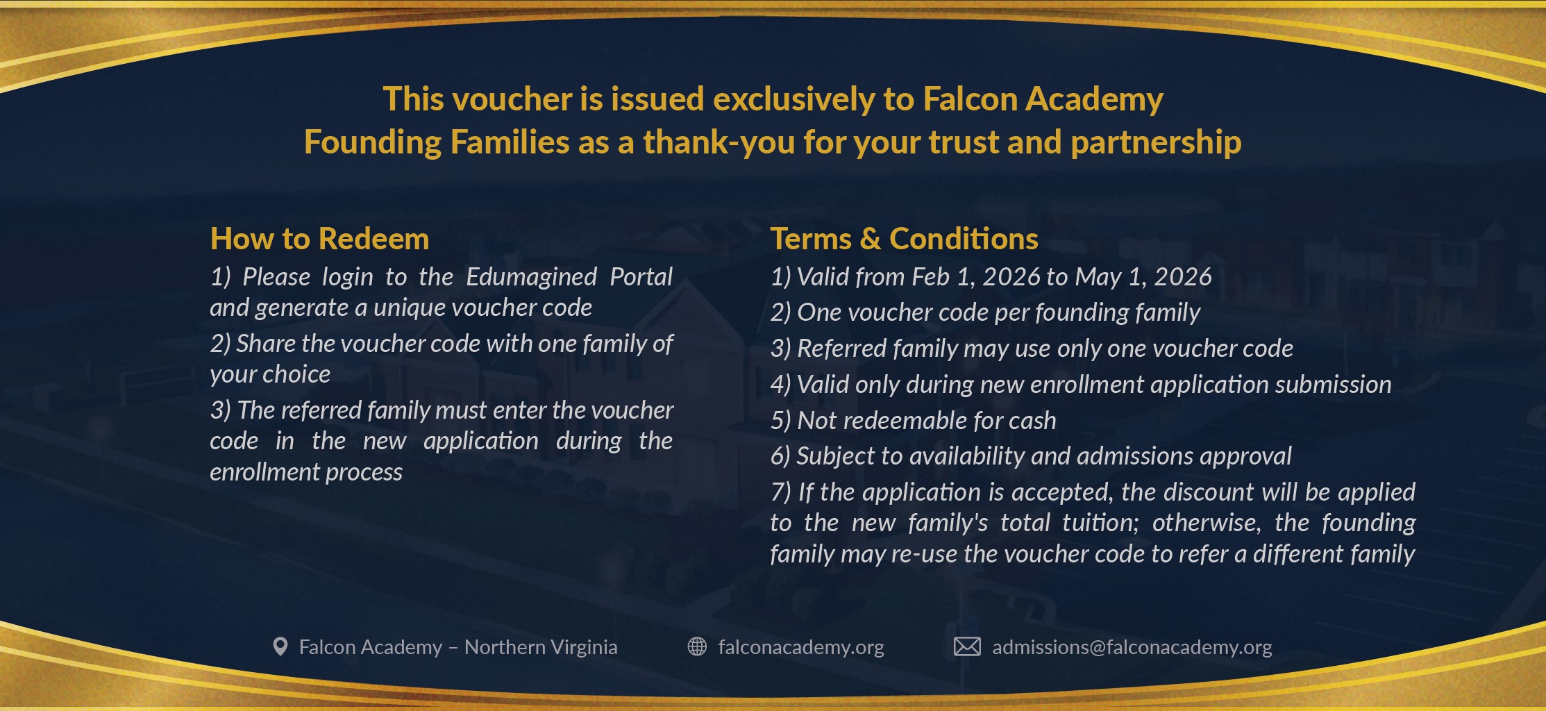 This voucher is issued exclusively to Falcon Academy Founding Families as a thank-you for your trust and partnership.