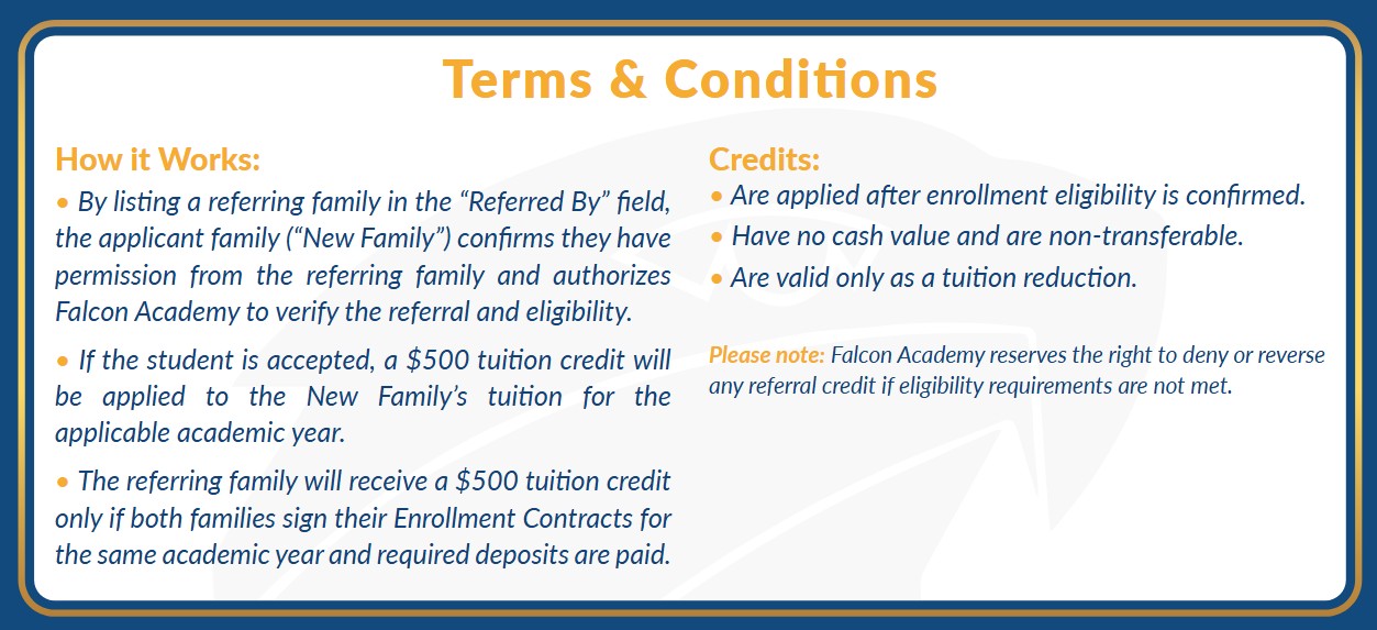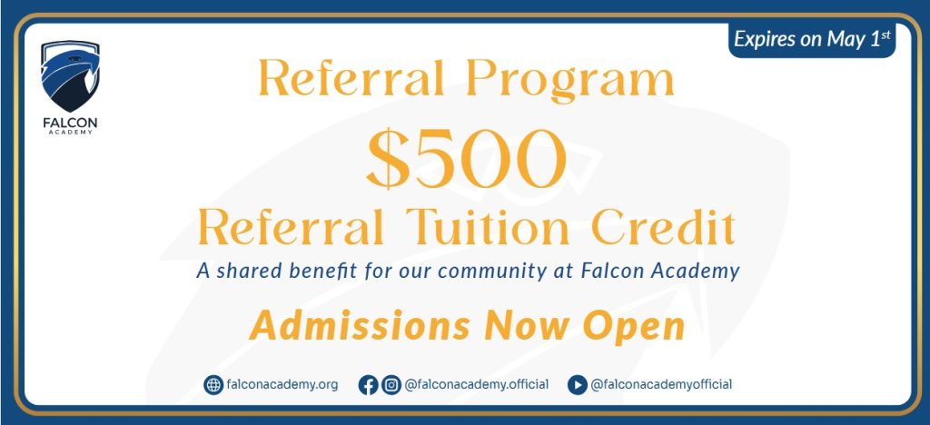 A shared benefit for our community at Falcon Academy. Help us grow our family and receive a tuition credit for your effort.