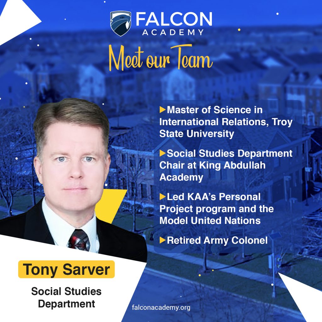 We are delighted to announce Mr. Tony Sarver will be joining our Social Studies Department! Mr. Sarver brings extensive experience from King Abdullah Academy (KAA), where he served for eight years as a Social Studies Teacher and Department Chair. During his time at KAA, he successfully led the IB Personal Project Program and the award-winning Model United Nations team. Mr. Sarver’s leadership and dedication will be a tremendous asset to our school community. Please join us in extending a warm welcome to Mr. Tony Sarver!