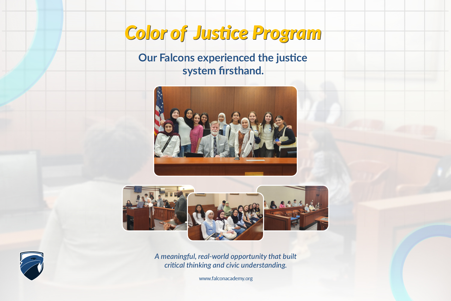 Nothing beats learning by doing! A group of our Falcon Academy middle schoolers spent the weekend at the Fairfax County Courthouse as part of the Color of Justice Program — getting an up-close, firsthand look at the justice system in action.